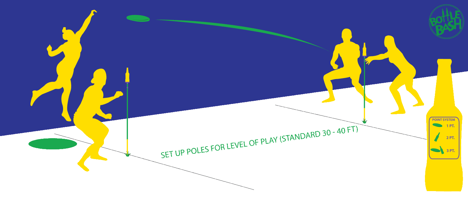 The goal is to knock your opponents’ bottle off their pole using the disc while the defending team tries to catch the disc and bottle before they hit the ground.